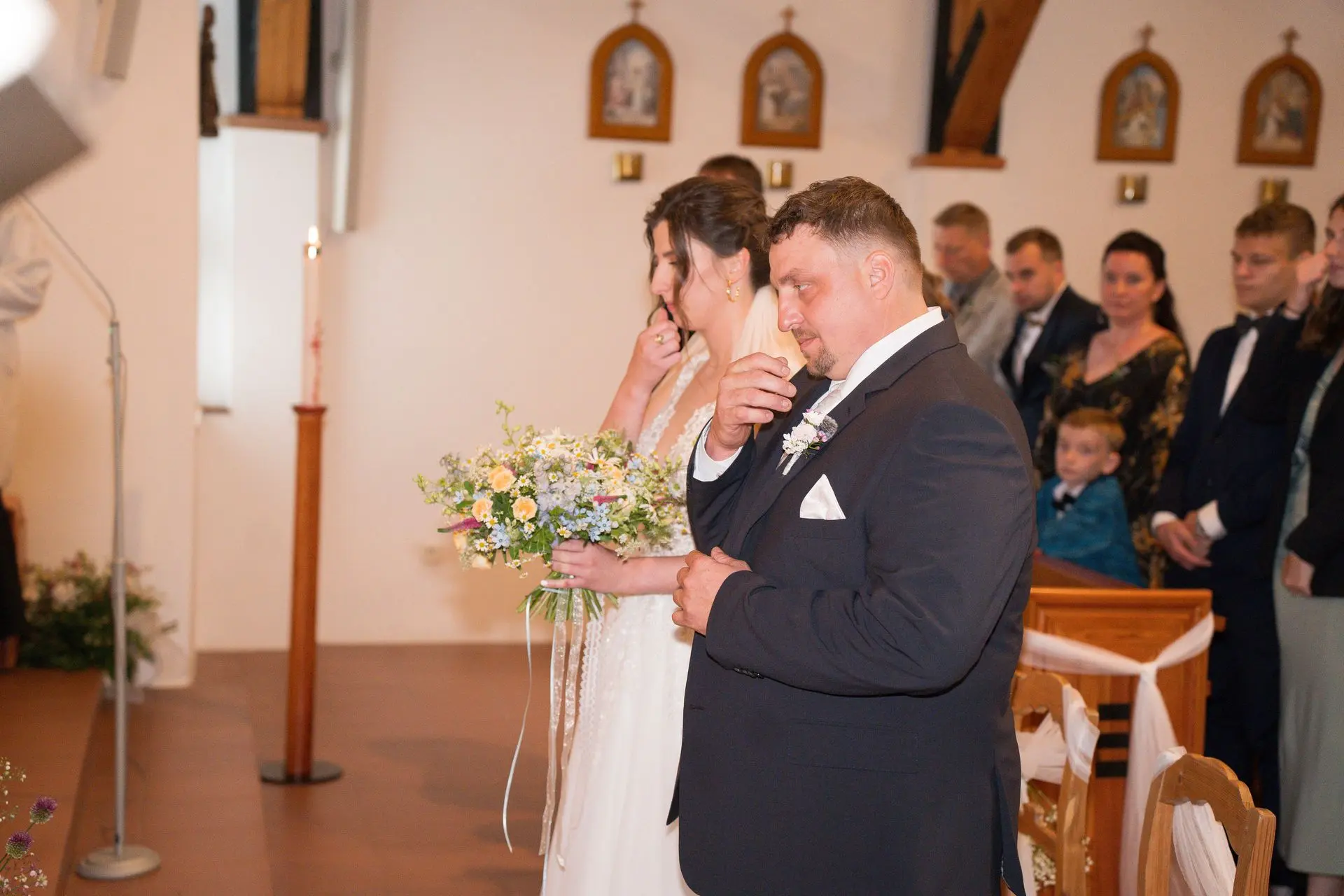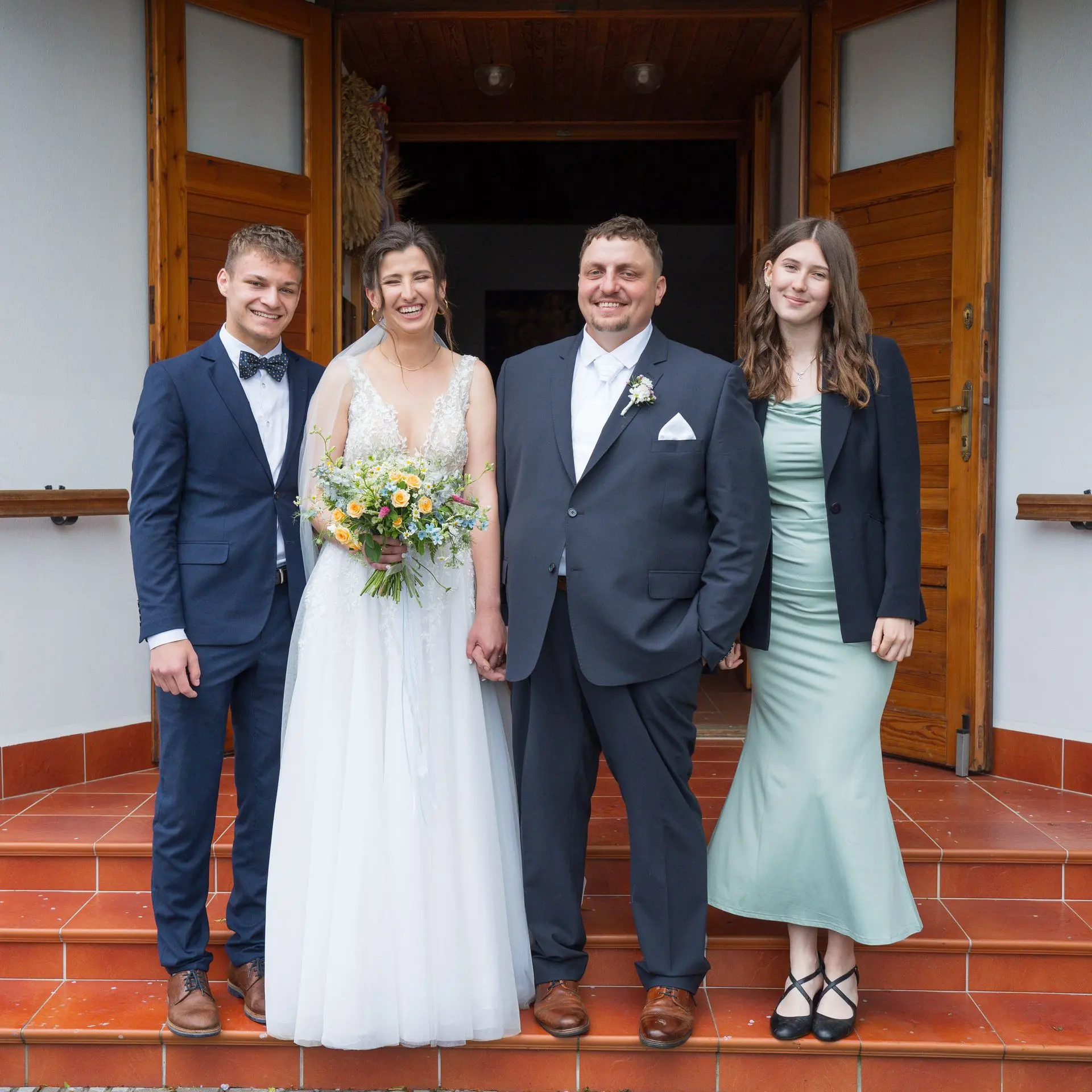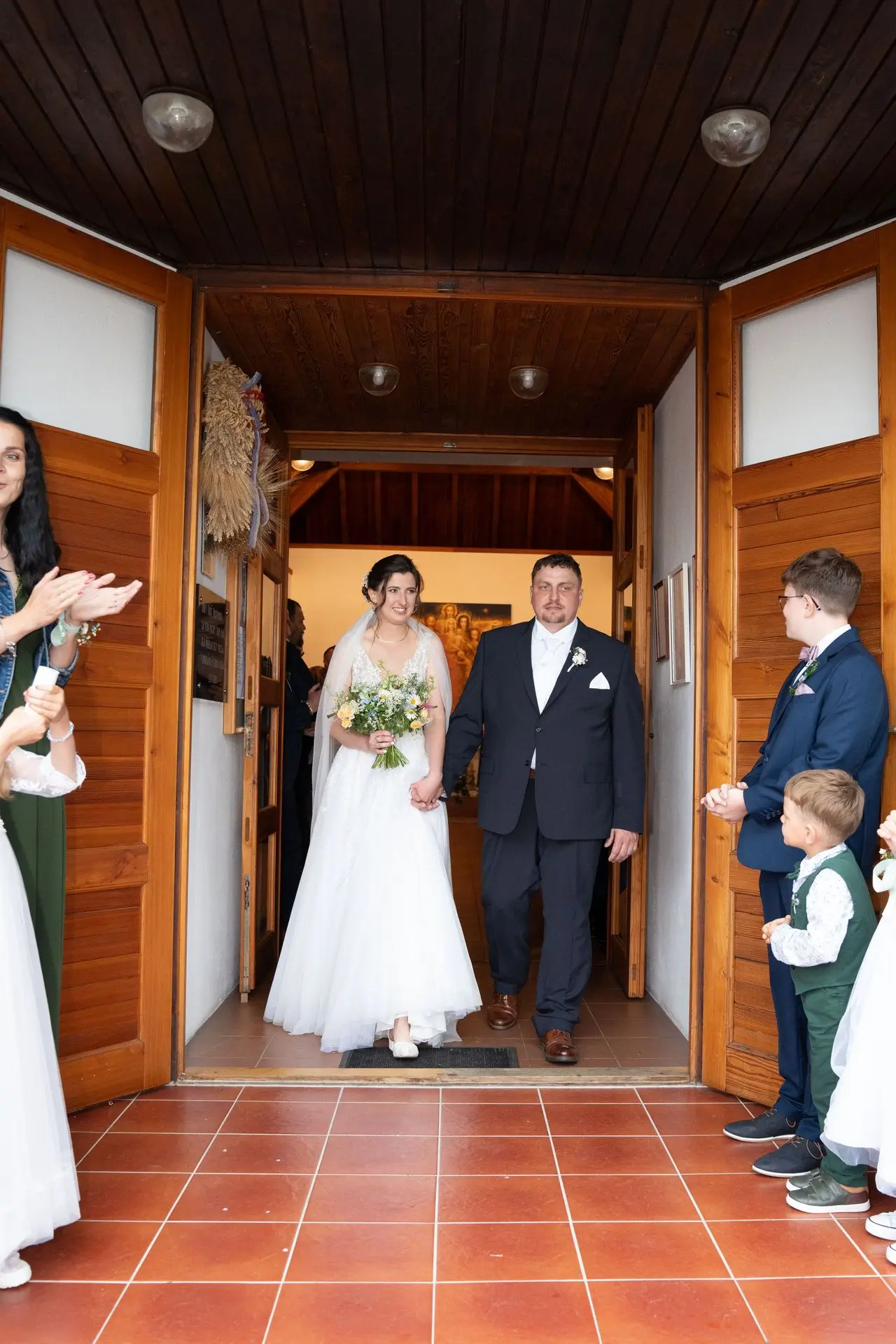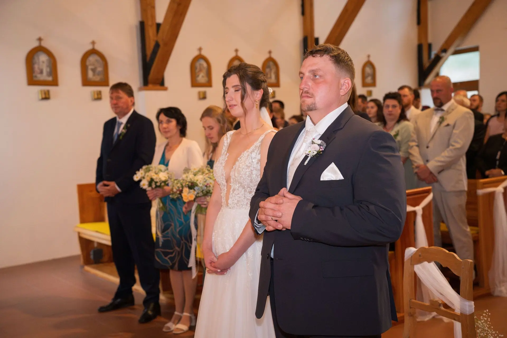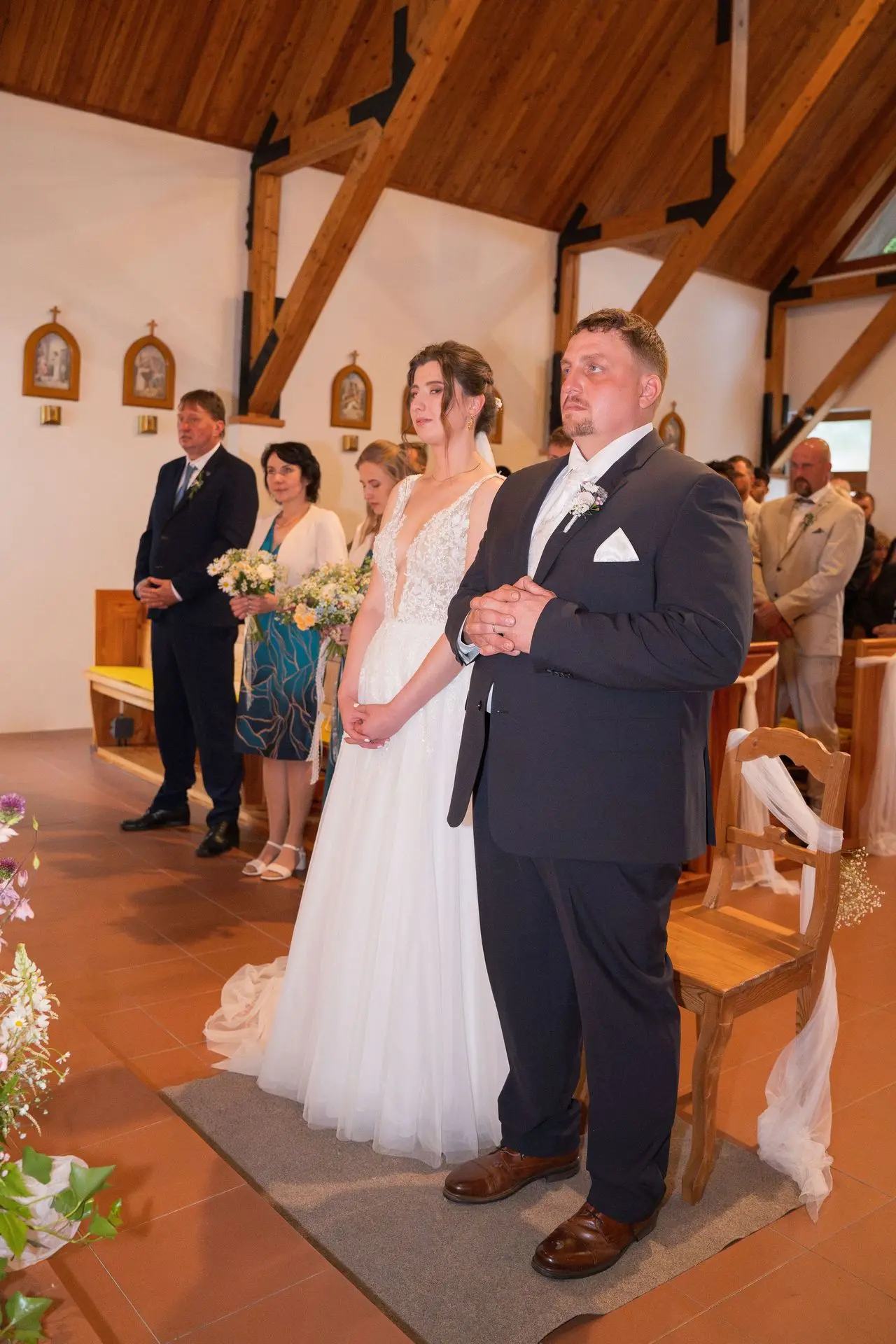 Řekli si své ano v kostele – v místě, kde se svět na chvíli zpomalil. Kde ticho mělo váhu a kde se na chvíli všechno zastavilo, jen aby mohli být spolu. Vilém s klidným úsměvem, Janča se světlem v očích, obklopení těmi, kterým na nich záleží.