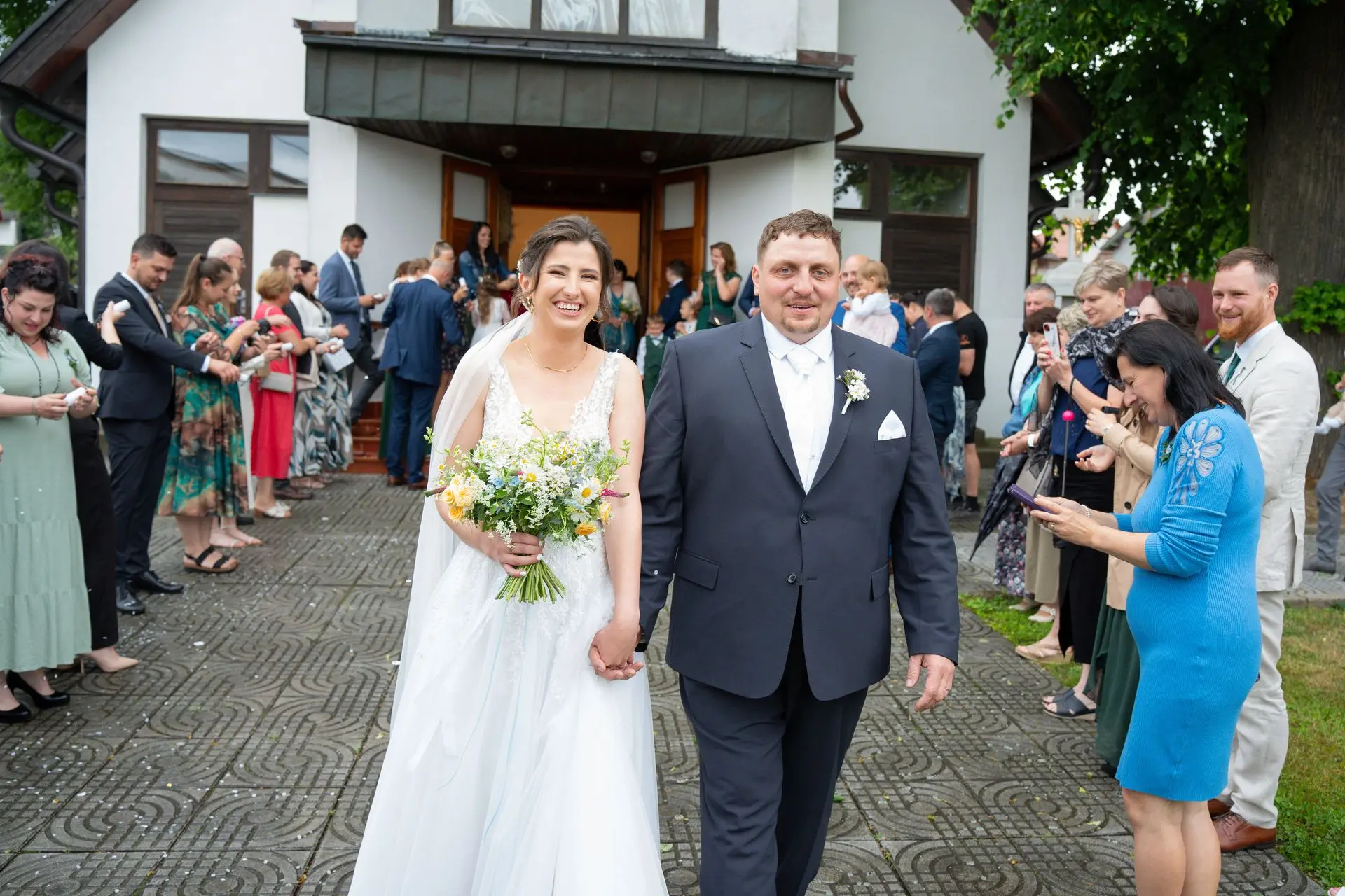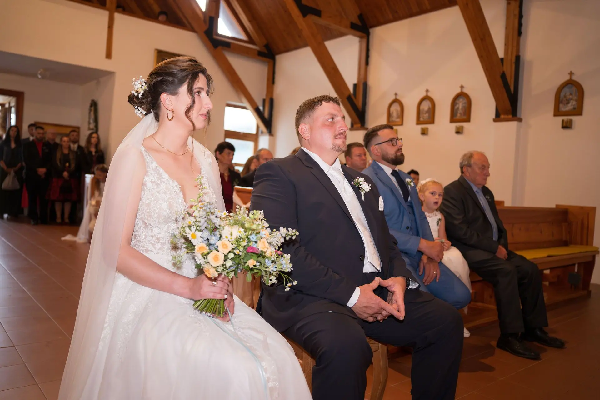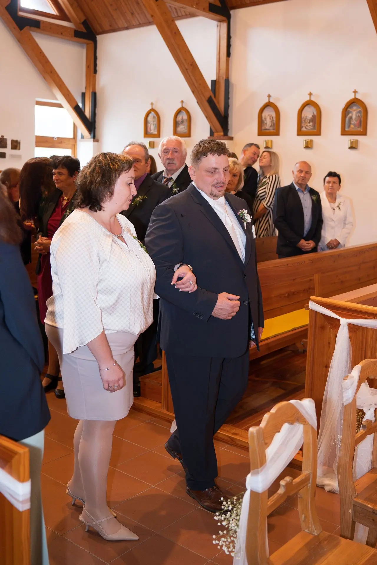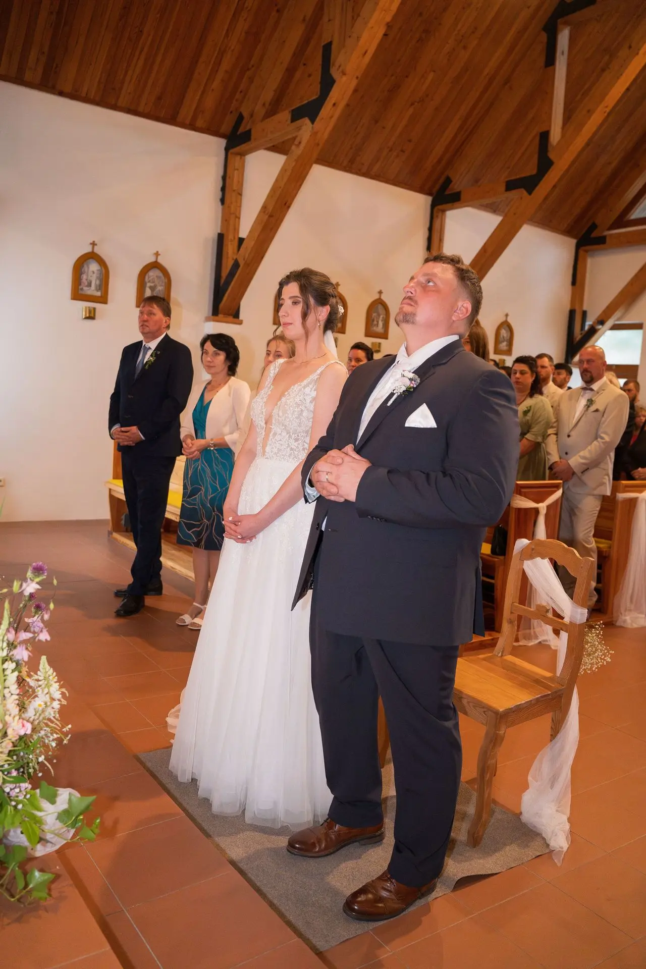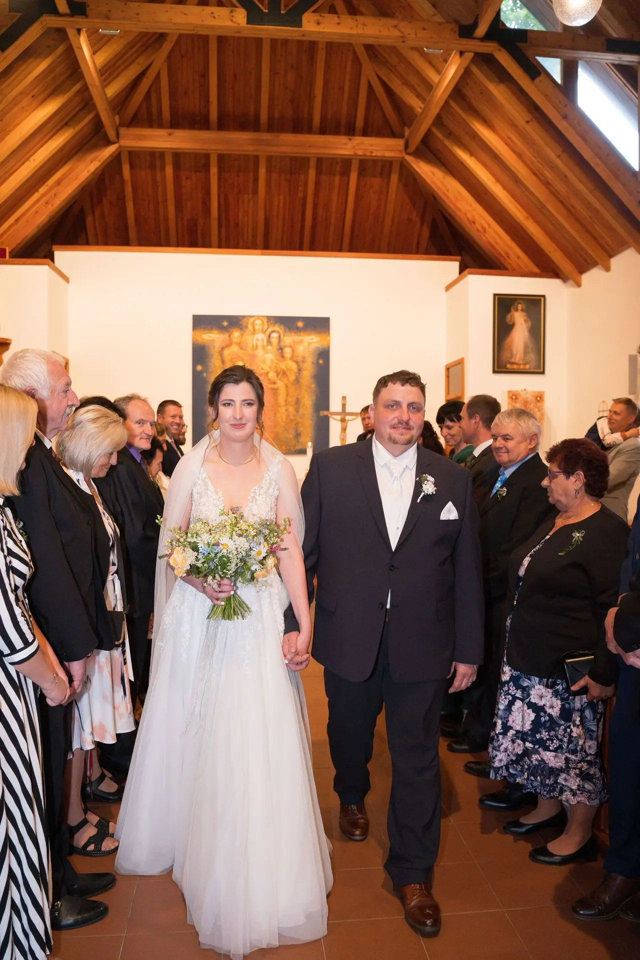 Řekli si své ano v kostele – v místě, kde se svět na chvíli zpomalil. Kde ticho mělo váhu a kde se na chvíli všechno zastavilo, jen aby mohli být spolu. Vilém s klidným úsměvem, Janča se světlem v očích, obklopení těmi, kterým na nich záleží.